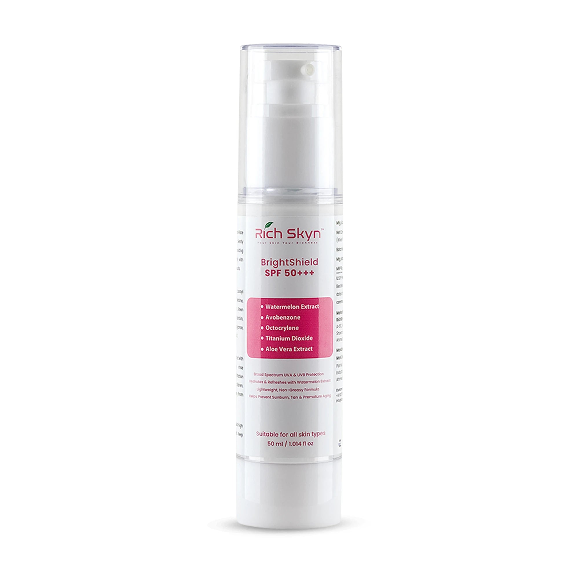 Rich Skyn Brightshield SPF 50+++ is your everyday defense for naturally radiant skin.This ultra-light gel formula provides broad-spectrum protection against UVA,UVB, and blue light while delivering long-lasting hydration. Glow smarter and brighter with a non-greasy shield that absorbs quickly for comfortable daily wear.
